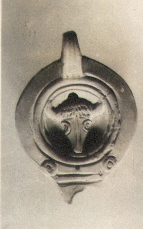 | Description: | End of nozzle and part of body broken away. On the discus, a boukranion. The rim plain. The handle grooved, semi-pierced, herringbone in front and back. U-shaped nozzle set off by two transverse grooves. On the base concentric grooves. Light red clay, unglazed. Type XXVIII of Corinth collection. Cf. Corinth IV, ii, pp. 102-114, nos. 786-1412, pls. XIII-XIX. | |