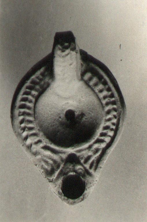 | Description: | Complete. Plain discus, herringbone on rim. The handle solid, grooved below; on its top, herringbone pattern (?). On the bottom, within two almond-shaped grooves, part of a signature. Unglazed. Pinkish-buff clay. Type XXVIII of Corinth collection. <graphic> | |