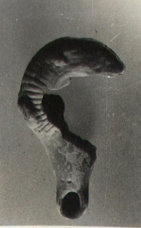 | Description: | Much of side wall and base missing. Low base ring; watch-shaped body; small filling hole with narrow depressed shoulder. Rim covered by continous line of ribs. Nozzle rounded on top and plain with blunt end. Vertical strap handle. On the left side a plastic cornucopia. Mold made. The glaze thin, reddish, and much flaked. The clay has fired to an ash gray color. Type XVIII of Corinth collection, type 48A of Agora collection. | |