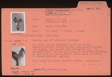 | Description: | Handle, much of side wall missing. Low base, rising slightly toward the middle; angular profile; around filling hole groove between two ridges; long nozzle with triangular tip. On shoulder ribs. On top of nozzle an elongated palmette; on left side of rim a plastic cornucopia. On bottom in raised letters: "AP---Σ". (ΑΡΙΣΤΩΝ ?). Red glaze somewhat flaked. Mold made. Type XVIII of Corinth collection, type 51B of Agora collection. | |
