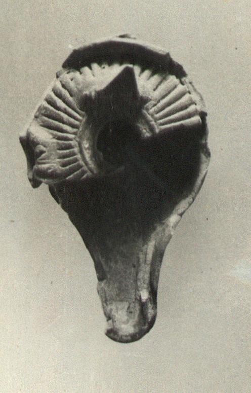 | Description: | Handle, and much of the top missing. Low base ring, watch-shaped body, shallow depression around filling hole, vertical strap handle. Long pointed nozzle surrounded by a raised rim; on the shoulder ribs, and on its left side a cornucopia. Thin reddish glaze. Type XVIII of Corinth collection, type 48A of Agora collection. | |