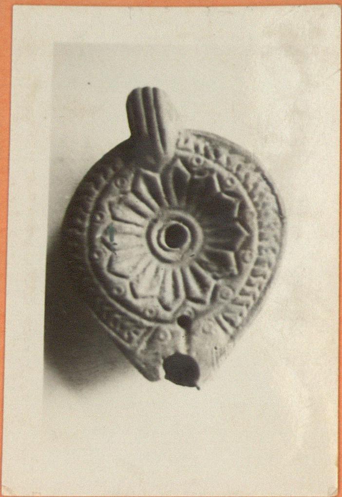 | Description: | On rim herringbone. On discus, rosette with pointed petals and stamped circles in the angles. Handle solid, triple grooved. Nozzle broken, with stamped circles. On reverse, double concntric circles, signed: "K Y". Unglazed. Red clay. Type XXVIII of Corinth collection. ADDENDA For nozzle, cf. Corinth IV, ii, p. 105, fig. 49, p. 4. | |