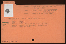 | Description: | Fragment of discus; nozzle broken. Rim, plain. On discus, seated lion. Red wash. Red clay. Type XXVIII of Corinth collection. ADDENDA For nozzle cf. Corinth IV, ii, p. 105. fig. 49, no. 1. Cf. Corinth IV, ii, no. 1216, pl. XVIII. | |