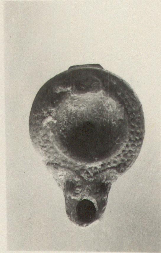 | Description: | The handle broken away, otherwise intact. Heavily blackened about the nozzle. A typical type XX of Corinth collection, except that it lacks the letter "A" beneath. Cf. Corinth IV, ii, pp. 76-78, nos. 418-453, pl. VII. ADDENDA The body is deep and of a rounded profile. It 's also double convex with a sharp angle between the two halves. Rim has rows of impressed dots. The nozzle is rounded and decorated with double rudimentary volutes, and from the volutes on the shoulder a raised line extends below the nozzle and separates it from the body. On back a ring in relief. | |