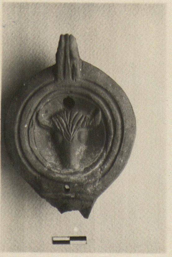 | Description: | Rim, plain, with a groove around the inner edge. On discus, boukranion. Handle partly pierced, double grooved. Nozzle broken; plain rounded, with two grooves setting it off from the rim. On reverse, five concentric circles. Unglazed. Light red clay. Type XXVIII of Corinth collection. ADDENDA For nozzle cf. Corinth IV, ii, p. 105, fig. 49, no. 6. | |