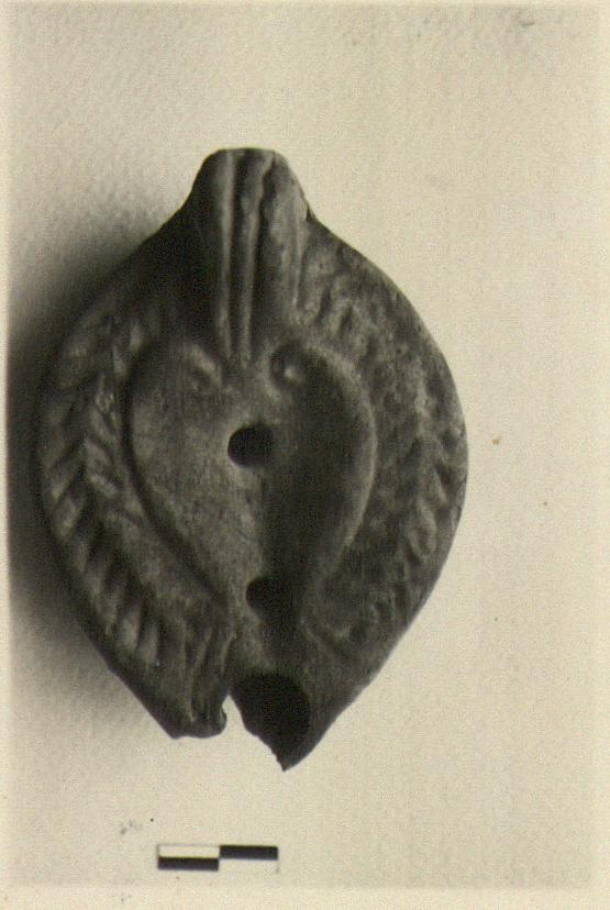 Discus, plain, heart-shaped, with two volutes next to handle.