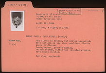 | Description: | The discus is broken, but mostly preserved. Wave pattern on the rim, panelled. Erotic scene on discus. Semi-pierced grooved handle. On the bottom, within two circular grooves, five small circles. Unglazed. Red clay. Type XXVIII (early) of Corinth collection. | |