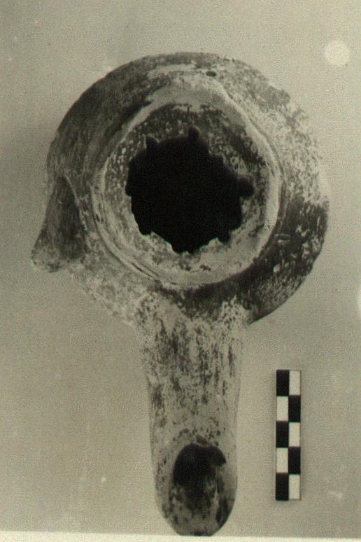 | Description: | The handle and the middle of the top are missing and the raised edge around the top. Ring base; the upper and lower parts of the body meet at an acute angle. Long pointed nozzle; vertical strap handle. Unpierced lug on one side. There was a high raised edge around the top. The top is pierced with many small holes, like a sieve. Much flaked black glaze. Wheel made D. Pinkish-buff clay. Type XII of Corinth collection, type 37A of Agora collection. | |