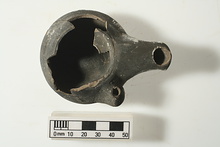| Description: | Mended from many pieces. Watch shaped body. Concave inner rim. Long nozzle, vertical strap handle. Pierced lug on one side. Wheel made. Gray clay, dull black glaze. Type 34A of Agora collection, type XII (early spreading variety) of Corinth collection. Cf. Agora IV, nos. 445-456, pp. 104-106, pls. 16, 24, 42. Corinth IV, ii, pp. 52-53, nos. 183-189, pl. IV. | |