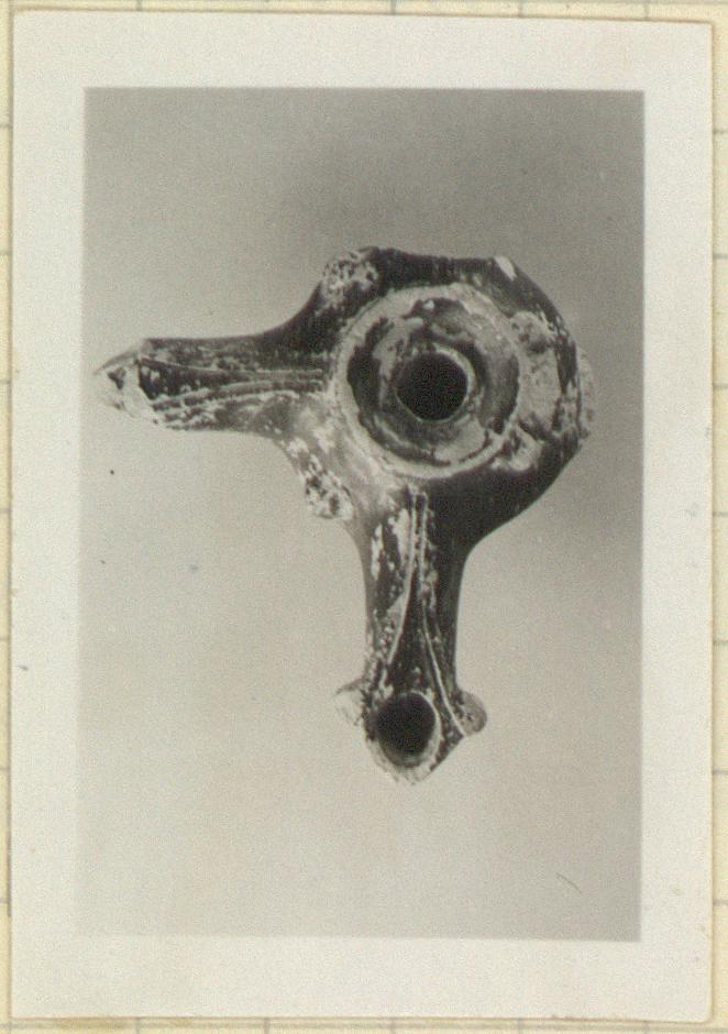 | Description: | Handle, end of one nozzle, and one complete nozzle missing. Ring foot, deep round body with three nozzles and a vertical strap handle. The nozzles triangular ended, with flaring grooves ending in small volutes on each side of the wick-hole. Similar volutes at point of junction of handle adjoining the rim. Shallow depressed top. Lugs in the shape of small lion 's heads on the side wall in the corners between the bases of the nozzles, and on each side of the handle. Buff clay, black glaze. Type XVIII of Corinth collection, type 43E of Agora collection. Cf. Agora IV, nos. 563-566, pp. 138-139, pls. 21, 47. | |