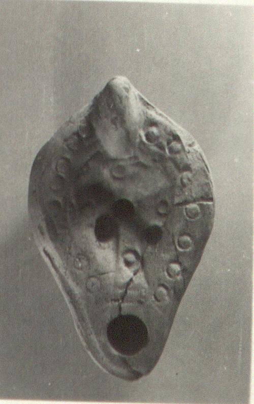 | Description: | Mended from three pieces. Large dots on the rim; on the discus a cross. The handle a solid knob. On the base, two almond-shaped grooves, with impressed circles, surrounding a palm branch. Unglazed. Pinkish-buff clay. Type XXVIII of Corinth collection. | |