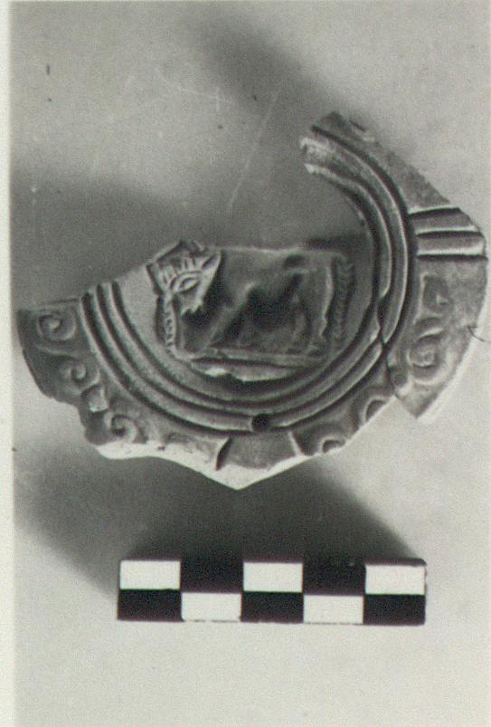 | Description: | Most of the discus and much of the rim preserved. On discus, a bull left, with fillet hanging from his horns. Double spiral pattern on rim. Dull red glaze. Type XXVIII of Corinth collection. Cf. Corinth IV, ii, pp. 102-114, nos. 786-1412, pls. 13-19; p. 108, for the bull. | |