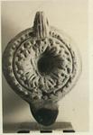 | Description: | Intact. Leaf pattern (?) and raised dots on discus. Round dots on rim. Handle partly pierced, grooved above and below. Concentric grooves on reverse. Buff slip. Micaceous orange clay. Type XXVII variant of Corinth collection. | |