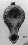 | Description: | Handle and part of nozzle missing. Double convex side wall meeting at a sharp angle; on upper side wall alternating triglyphs and circles. Triangular ended nozzle, concave discus, and vertical strap handle. Signed underneath. Mold made. Light red clay; red wash, worn. Type 58B of Agora collection, type XVIII (?) of Corinth collection. Cf. Agora IV, nos. 808-814, pp. 208-210, pls. 25, 28, 54. Corinth IV, ii, pp. 61-66, nos. 301-311, pl. VI. | |