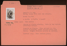 | Description: | Center of discus missing. Hole in the bottom; otherwise intact. Rosette on discus. Vine pattern on rim. Handle unpierced, three grooves above and below. Single circular groove on reverse. Thin reddish glaze. Reddish clay. Type XXVIII of Corinth collection. | |