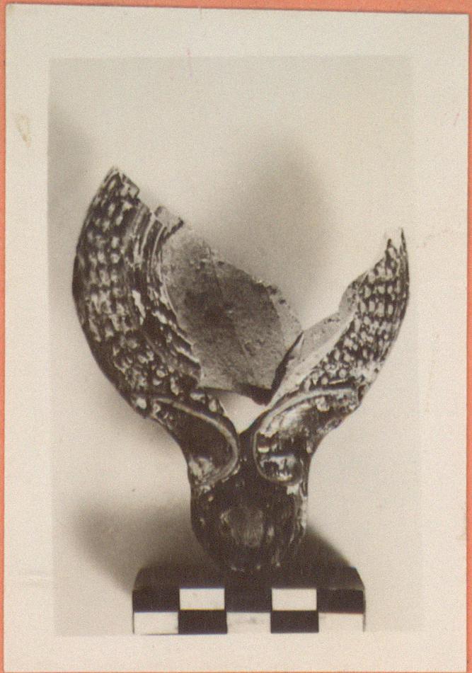 | Description: | Flat bottom, fairly long nozzle with volutes at its base. Body covered with nodules. Signed on bottom with the typical letter "A". Purplish-black glaze, thin; rather shiny. Type XX of Corinth collection. Cf. Corinth IV, ii, pp. 70-73, nos. 372-382, pl. VII. | |