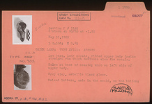 | Description: | Low base, long nozzle, ribbed upper body inside straight rim which encloses also the nozzle. Holes at base of nozzle; knob on left side of upper body. Raised letters, made in the mould, on the bottom. Metallic black glaze. Gray clay. Type XXXI of Corinth collection, type 52A of Agora collection. <graphic> | |