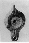 | Description: | High vertical handle, with a single groove and a large opening. Plain rim save for a knob on each side, towards the front. Plain disc. A long nozzle with a groove down it. Base marked by a very low ring; glaze peeled too badly to tell certainly whether it was signed or not. Coarse brick red clay, with a thick matte red glaze peeling. Type XXVI of Corinth collection. Cf. Corinth IV, ii, pls. 30, 526, 527. | |
