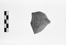 Almond-shaped (?) grooves enclosing plain cross. Impressed circles in the arms.
