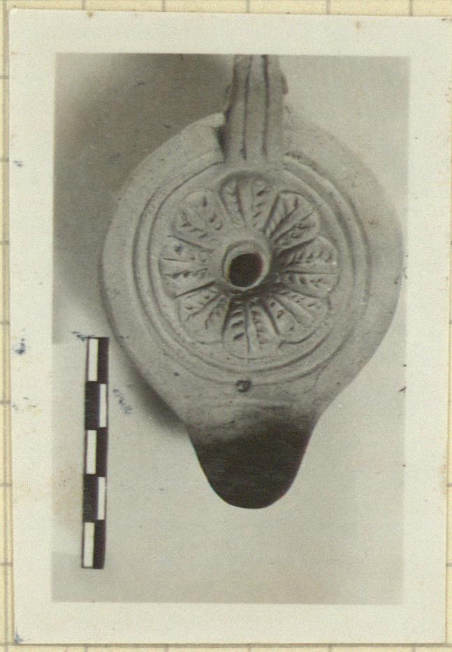 | Description: | Rosette on discus. Plain rim. Handle semi-pierced. Incised herring-bone at base of double-grooved handle. Concentric grooves on bottom. Light red clay, unglazed. Type XXVIII of Corinth collection. Cf. Corinth IV, ii, pp. 102-114, nos. 786-1412, pls. XIII-XIX. | |