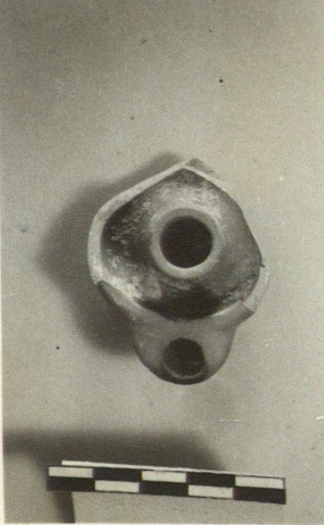 | Description: | Bottom, collar, and front with nozzle preserved. High base, convex side wall; hollow cylinder through the middle. Neatly made. Wheel made. Thin red glaze inside only. Fine pinkish-buff clay. Type IV (late variants) of Corinth collection, type 27A' of Agora collection. | |