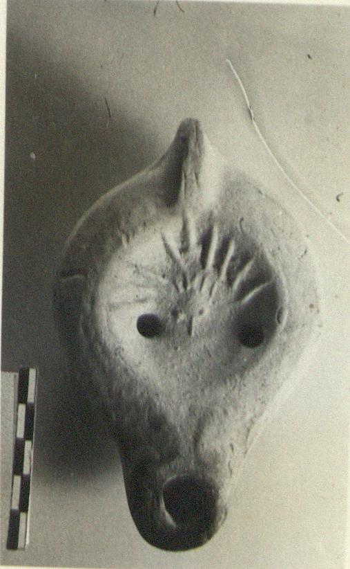 | Description: | Unpierced double grooved handle. Base outlined by circle. Long nozzle. On the discus, rayed head of Helios. Rim pattern uncertain. From a very worn mould. Unglazed. Light red clay. Type XXVIII of Corinth collection. | |