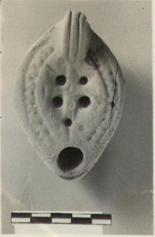 | Description: | Part of side missing. On discus, Greek cross with four filling holes. On rim herring bone. Handle solid. On bottom a signature within double bounding line. Brown clay, unglazed. Type XXVIII of Corinth collection. Cf. Corinth IV, ii, pp. 102-114, nos. 786-1412, pls. XIII-XIX. ADDENDA: On base the letters: "Σ Ω". | |