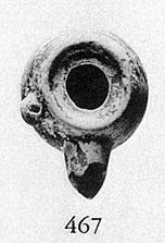 | Description: | Most of nozzle missing. No handle or base. Wheel made. The bottom lightly nicked. Pierced lug on one side of body. Sunken top. Black glaze, much peeled. The blackening of the broken edges around the nozzle suggests that the lamp was used after it was broken. Type XIIB (late straight variety) of Corinth collection, type 35A of Agora collection. | |