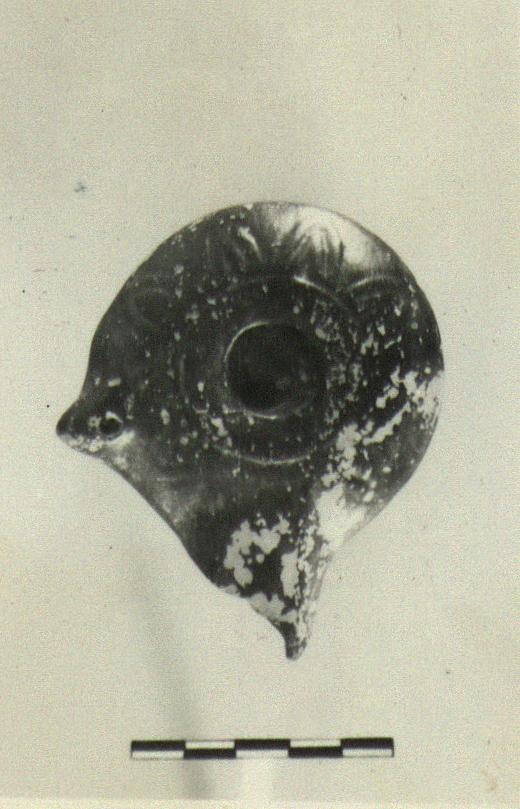 | Description: | Body fragment and end of nozzle missing. No handle. Radiating leaf pattern in relief on upper body. Pierced lug on one side. Rather metallic black glaze. Type XVIII of Corinth collection, type 46A of Agora collection. | |