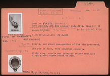 | References: | Publication: Agora IV Publication Page: Agora 4, s. 52, p. 42 Publication Page: Agora 4, s. 235, p. 225 Deposit: E-F 12-14 Deposit: E-F 12-14.1 Lot: Β' 11 Lot: Β' 12 Notebook: Β'-7 Notebook Page: Β'-7-56 (pp. 1130-1131) Card: L 1950 |