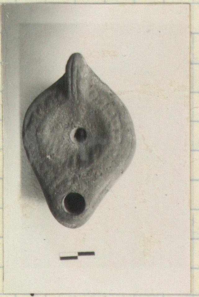 | Description: | On rim, herringbone, worn. Discus, plain, worn, with faint traces of shell pattern. Handle solid, double grooved. Nozzle, plain, rounded. Reverse, somewhat defaced; apparently plain. Unglazed. Light red clay. Type XXVIII of Corinth collection. | |