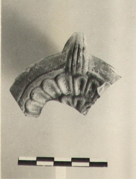 | Description: | Fragment from back part. Plain rim; on discus a double rosette, grooved handle, triple above, double below, unpierced. Dull red glaze. Red clay. Type XXVIII of Corinth collection. | |