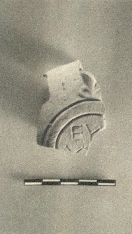 | Description: | A fragment preserving part of the bottom, side wall and base of handle. Part of the signature on the bottom. Fairly fine light red to buff clay. Type XXVIII of Corinth collection. <graphic> | |