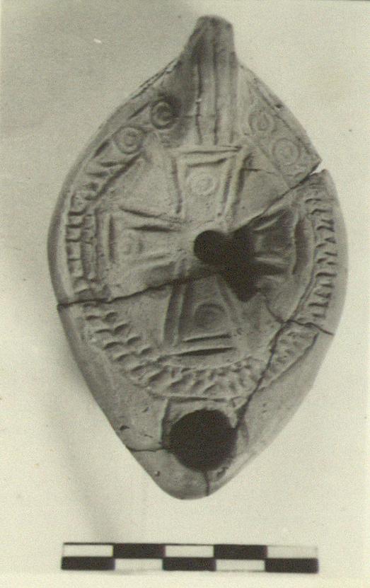 | Description: | Complete except for small pieces. Triple-grooved unpierced handle. On discus, a maltese cross with dotted circle at end of each arm. Herringbone pattern on rim except for two dotted circles on each side of handle. A leaf pattern on bottom, with impressed circles on lower part of wall. Unglazed. Coarse red clay. Type XXVIII (?) of Corinth collection. | |