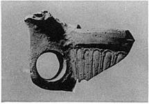 | Description: | Fragment of upper back part of a moulded lamp. Deep body with elongated moulded petals outside. Very narrow flat rim, cross-hatched. Deep concave discus with ivy leaves in relief near top; trace of a rosette below. Vertical handle with large opening; applied to the top, a large moulded leaf which terminates in volutes on the rim. No trace of glaze. Fine greenish-buff clay. Type XXI (?) of Corinth collection. | |