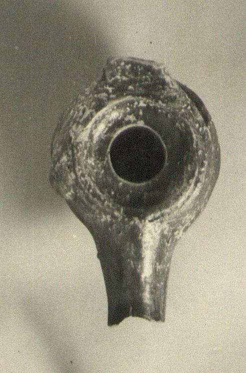 | Description: | End of nozzle and high band handle broken off. Plain slightly sunken top. Column (?) on which lamp stood broken off shortly below attachment to lamp. Lug on one side. Mold made. Brownish-red glaze. Type XII (late straight variety) of Corinth collection, type 43 variant of Agora collection. | |