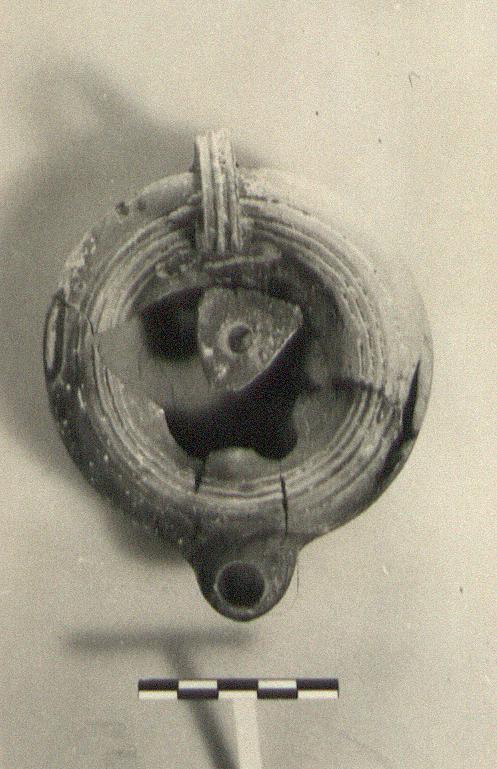 | Description: | Mended from many pieces; part of discus missing. Narrow rim, ridged where it joins the plain concave discus. High-swung grooved vertical handle. In relief on bottom inside a low base ring: "A". Red glaze, rather brownish; much peeled. Thin brown fabric. Type XXV of Corinth collection. | |
