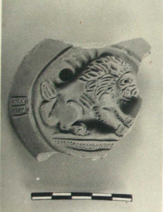 | Description: | Fragment of top only. Plain rim with herringbone panels. On the discus, a lion stead right, growling. Light red clay and traces of wash. Type XXVIII of Corinth collection. | |
