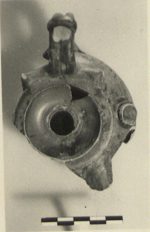 | Description: | Much of wall and most of nozzle missing. Neat ring foot; plump rounding body, plain concave discus surrounded by a flat raised band. High-swung double handle ending in ears at the upper attachment; something broken off it at the top. On the right side of the body a disc-like knob. The start of the nozzle, preserved on the top, is not on the same axis as the handle. Perhaps there were two nozzles. Firm red to black glaze. Pinkish-buff clay. Type XIII of Corinth collection, type 40B of Agora collection. | |