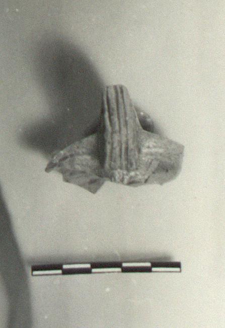| Description: | Handle and small adjacent piece preserved. From a lamp with a very shallow body. Vertical handle pierced through, but with a bit of clay stilll remaining. Three grooves on front of handle, two on back. These grooves continue down to the reverse, spreading outward as they go, and having other grooves at sides and center. Brownish-black glaze. Buff clay. Type XXVIII (?) of Corinth collection. | |