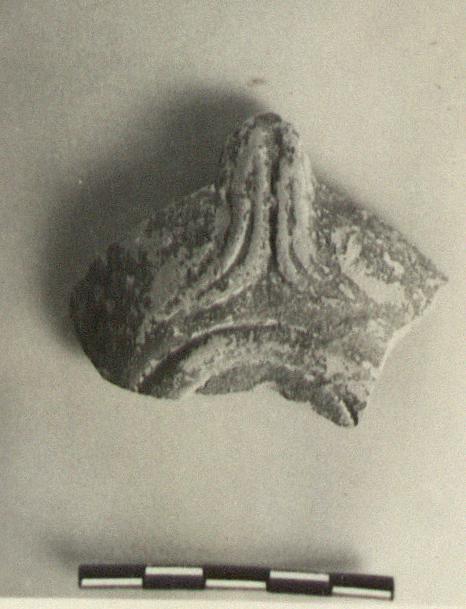 | Description: | Base of handle and part of reverse preserved. Base of handle has two ridges, each with a groove, spreading out like tails as they reach the reverse. Groove and ridge around the circular reverse. From a lamp similar to L 2135 (Σ 377). Brownish-black glaze. Buff clay. Type XXVIII (?) of Corinth collection. | |