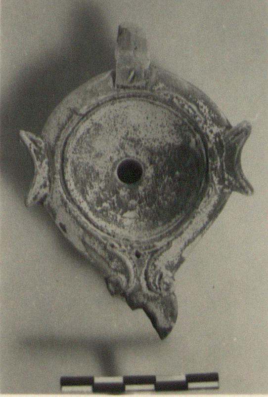 | Description: | Vertical handle and end of nozzle missing. Volutes at base of nozzle, and an air hole. Plain discus. Flaring lug handless at the sides. Flat bottom outlined by a single groove. Thin brownish glaze, much peeled. Grayish-buff clay. Type XXIV of Corinth collection. | |