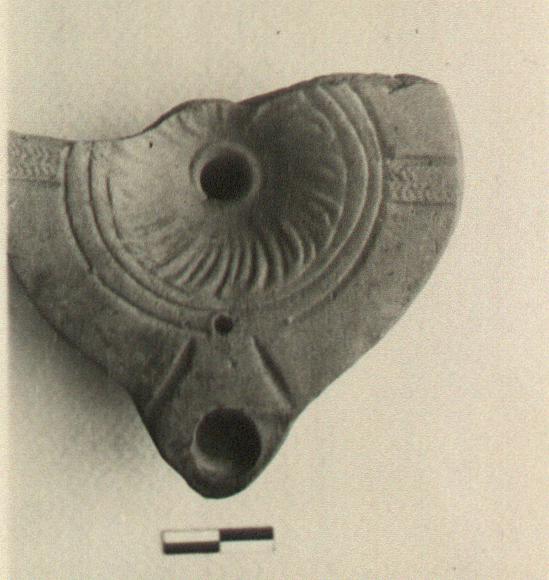 | Description: | Front part only preserved. Handle missing. Plain rim, with herringbone panels. On discus, twisted rosette. On reverse, single circular groove, signed. Unglazed. Clay buff outside, pinkish in the breaks. Type XXVIII of Corinth collection. ADDENDA For nozzle cf. Corinth IV, ii, p. 105, fig. 49, no. 1. | |