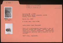 | Description: | Part of a rectangular lamp with a row of nozzles across one side. Three, and the start of a fourth preserved. Underneath, rectangular grooves and a rosette (?) in relief. Unglazed. Buff clay. | |