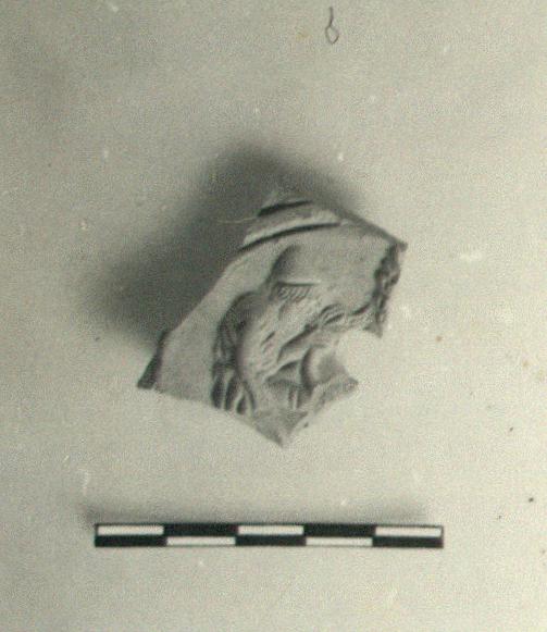 | Description: | Fragment of discus only. To left, a figure in exomis and with pilus on head grasps the tail of a lion (?). Unglazed. Fine pinkish-buff clay. Type XXVII (?) of Corinth collection. | |