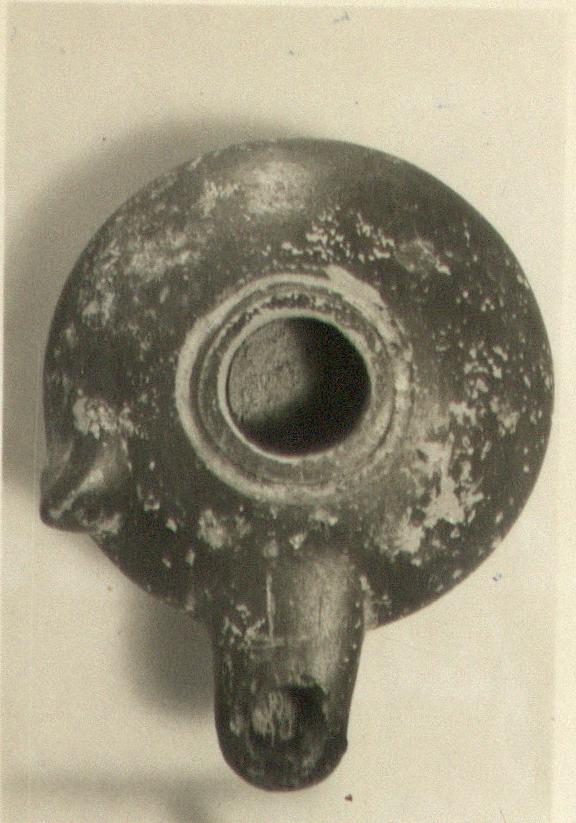 | Description: | Intact. Pierced knob on shoulder; ring foot reserved beneath. Wheel made Thin black glaze both inside and out, scratched from a groove around the filling hole. Charcoal clings to the wick hole. On the neck, scratched in the glaze: "Π". Type IX (clamshell variety) of Corinth collection, type 29A of Agora collection. | |
