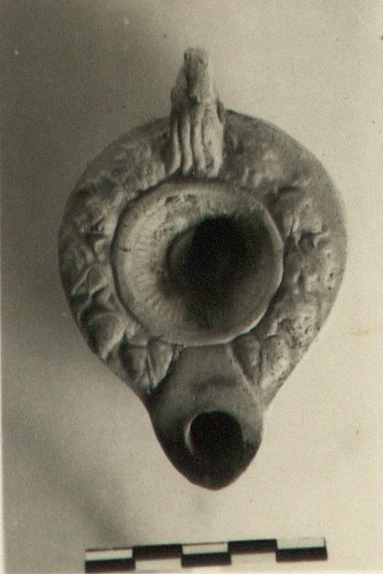 | Description: | Handle grooved above only, and pierced. Rays on discus; vine pattern on rim; underneath, a single circular groove around a raised leaf. Unglazed. Micaceous pinkish clay. Type XXVII (late variety) of Corinth collection. | |