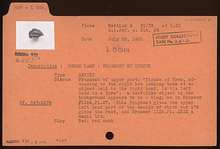 | Description: | Fragment of upper part of discus. On discus, figure of Eros, advancing to the right but looking back at an object held in the right hand, in his left hand is a lyre; a leaf-like object in the background appears to be a wing. Red wash. Red clay. Type XXVIII of Corinth collection. Cf. Corinth IV, ii, nos. 1124, 1132, pls. XV, XXIX. ADDENDA This fragment gives the upper left hand part of the design of which L 176 gives the rest, and lamp no. 1132 of Broneer collection a small bit. Cf. L 176. | |