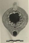 | Description: | Intact except for center of discus. Herringbone pattern on rim, interrupted by a stamped circle on either side, all herringbones pointing away from the circles. Rosette on discus, with small dots between petal-tips. Solid handle, triple grooved above, double below. Circular reverse, with double grooves enclosing a signature. Thin red to black wash. Light red clay. Type XXVIII of Corinth collection. | |