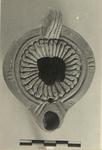 | Description: | Intact except for center of discus. Slightly warped in firing. Plain rim with panels, grooved. On either side of panels, nozzle and handle, a stamped circle. Many-petalled rosette on discus, edges of petals crimped over. Solid handle with three grooves above and two below. Stamped semi-circles at base of handle. Circular reverse with double concentric grooves, enclosing a signature. Thin red wash. Red clay. Type XXVIII of Corinth collection. <graphic> | |